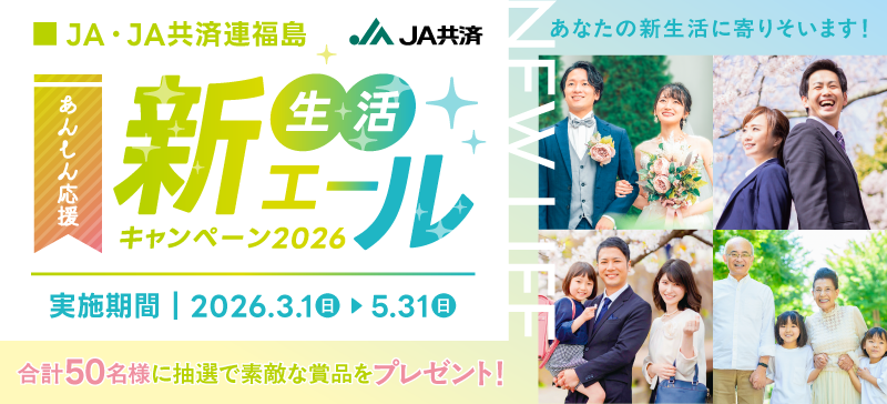 ●JA共済連 福島(以下、「主催者」といいます。)が特設サイト(https://www.jakyosai-fukushima.jp/cgi-bin/campaign.cgi)を活用して実施する「新生活エールキャンペーン2026」(以下、「本キャンペーン」といいます。)に応募の方(以下、「応募者」といいます。)は、以下をよくお読みいただき、同意の上応募してください。応募いただいた場合は、本規約に同意したものとみなします。万が一同意いただけない場合は応募を中止してください。