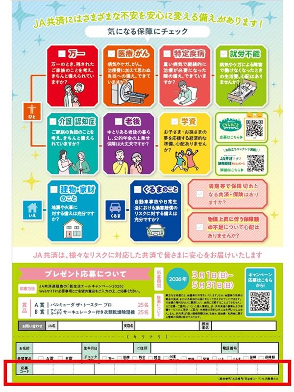 この度はJA・JA共済連 福島「新生活エールキャンペーン2026」にご応募いただき誠にありがとうございます。以下のアンケートにご回答いただき、確認ページから「応募する」ボタンを押して応募完了となります。