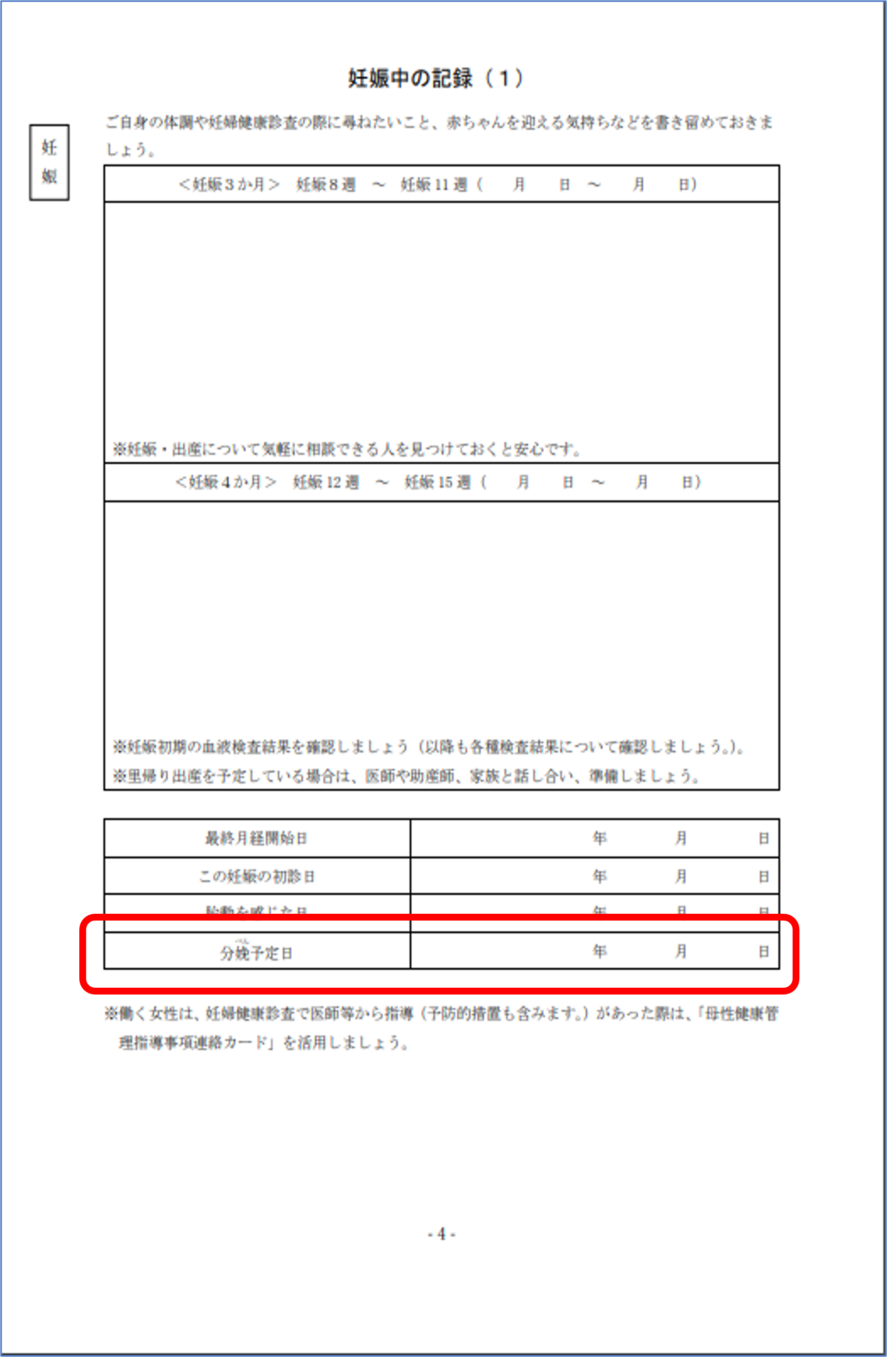 母子健康手帳に分娩予定日が記載されたページの例